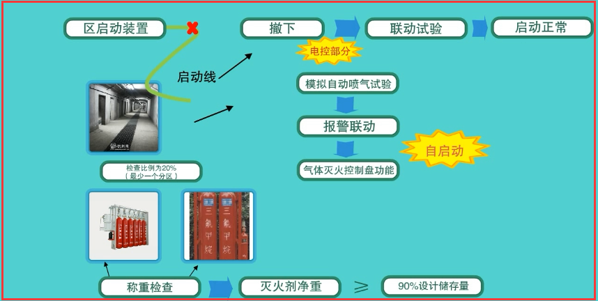 2、對每個防護區(qū)進行一次模擬自動噴氣試驗。通過報警聯(lián)動,檢驗氣體滅火控制盤功能,并進行自動啟動方式模擬噴氣試驗,檢查比例為20%(少一個分區(qū))。