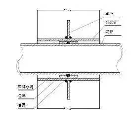 1.剛性套管安裝:主體結(jié)構(gòu)鋼筋綁扎好后,按照給排水施工圖標(biāo)高幾何尺寸找準(zhǔn)位置,然后將套管置于鋼筋中,焊接在鋼筋網(wǎng)中,如果需氣割鋼筋安裝的,安裝后必須用加強筋加固,并做好套管的防堵工作。剛性套管安裝如圖所示: